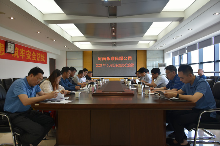 2021年5月28日,河南省永聯民爆器材股份有限公司召開了5月份安全辦公會議,公司領導班子、安委會成員、安委會辦公室成員以及宜陽縣、汝州、陜州、信陽平橋、淅川、鶴壁等6家分公司負責人參加了會議。會議由公司副總經理靳義國主持,公司董事長、總經理劉嵩參加會議并講話。